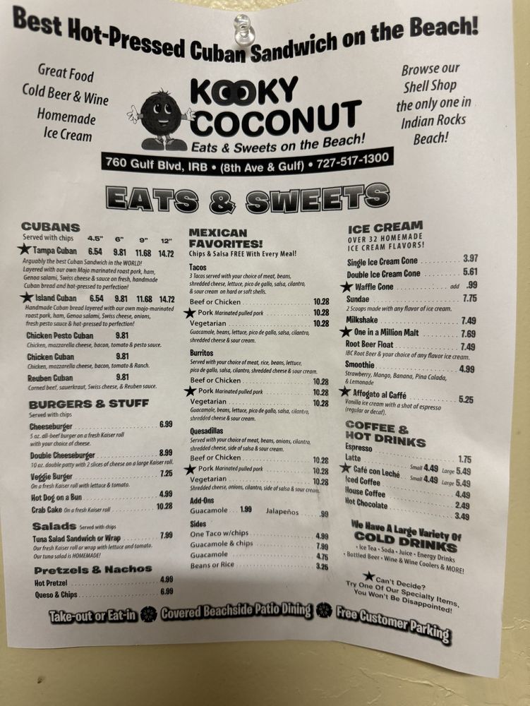 Kooky Coconut, a cozy cafe located in Indian Rocks Beach, FL, offers a diverse menu of sandwiches, salads, pretzels, nachos, and Mexican favorites. With options for vegans and a range of amenities including outdoor seating, free Wi-Fi, and friendly staff, it's a great spot for a casual meal. Customers rave about the delicious ice cream, Cuban sandwiches, and quick bites. The Island Cuban and toasted coconut ice cream are fan favorites, with one reviewer suggesting a new sandwich idea. Whether you're looking for a savory lunch or a sweet dessert, Kooky Coconut has something for everyone. The laid-back atmosphere and affordable prices make it a must-visit spot in Indian Rocks Beach.